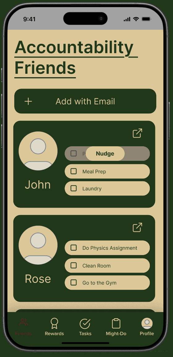 For students and professionals, who have procrastination issues, our app provides the ability to share tasks with accountability partners paired with a reward/consequence system, unlike current alternatives like Todoist, Forest, and Habitica. The app follows a very simple interface and system without overcomplicating your procrastination management systems.