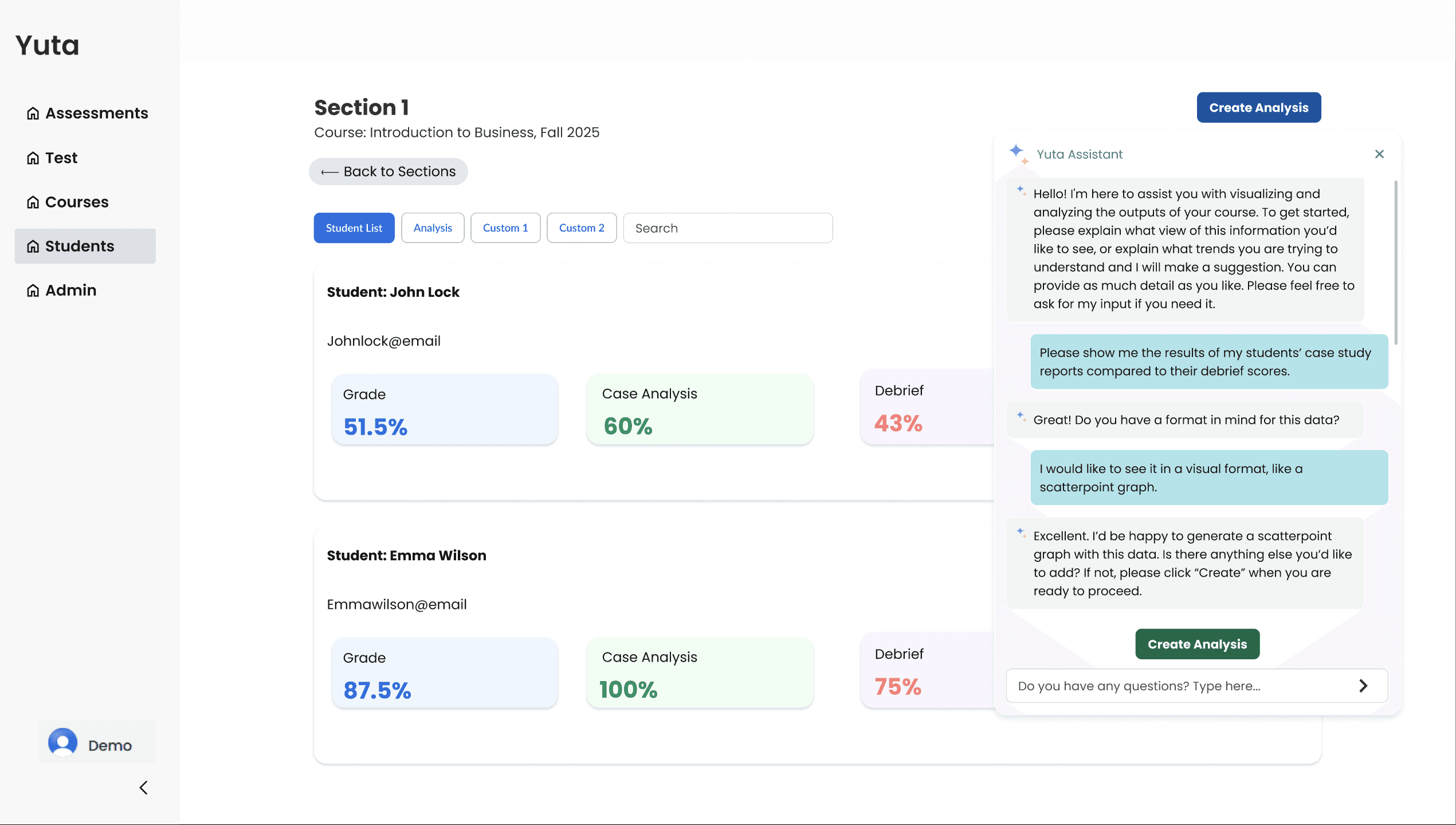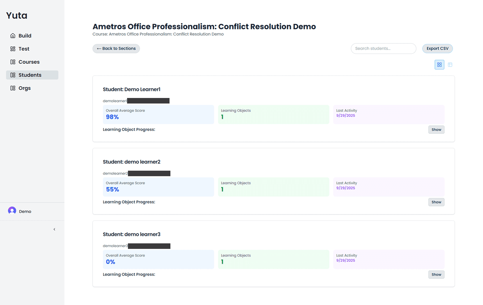 Ametros Yuta acts as an AI-powered guide, working with instructors to define exactly what kind of learning scenario they want to create—no coding or developer intervention required. With Ametros Yuta, instructors can quickly create, deploy, and analyze tailored learning scenarios that adapt to individual needs, dynamically assessing student understanding.