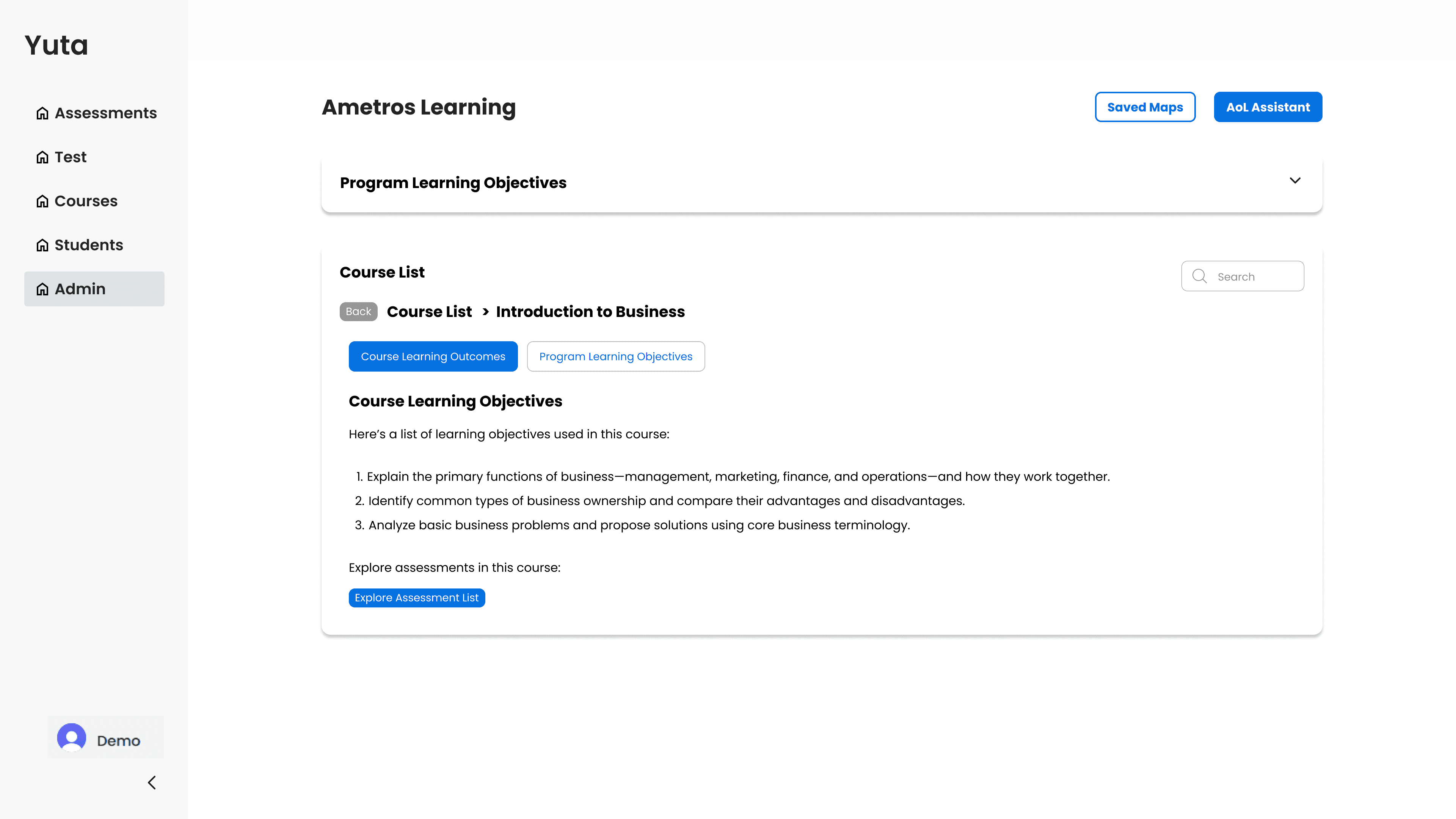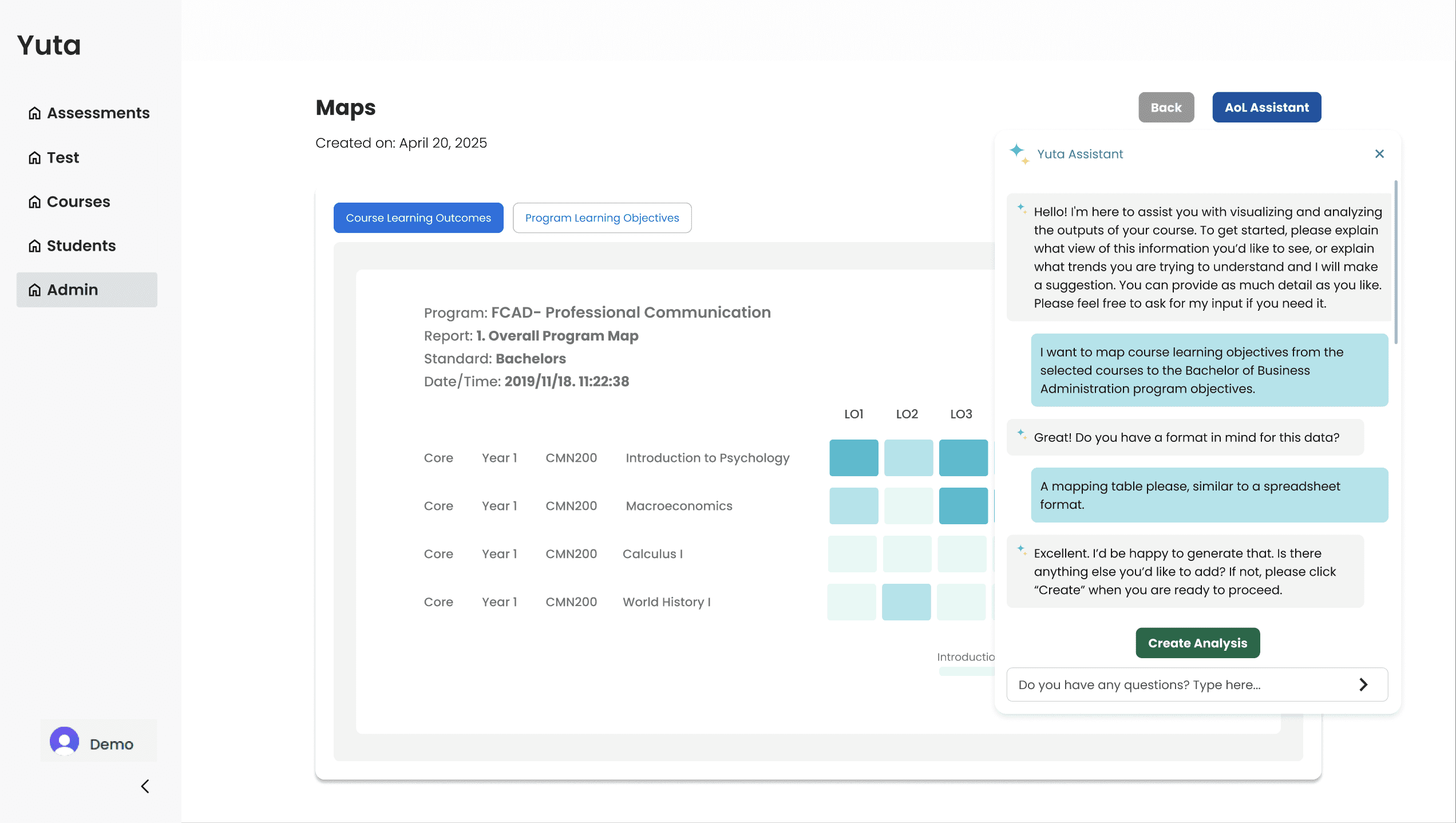 Mapping of CLOs and PLOs are accessible through AoL Assistant chatbot. The button placement is consistent with the rest of the platform.