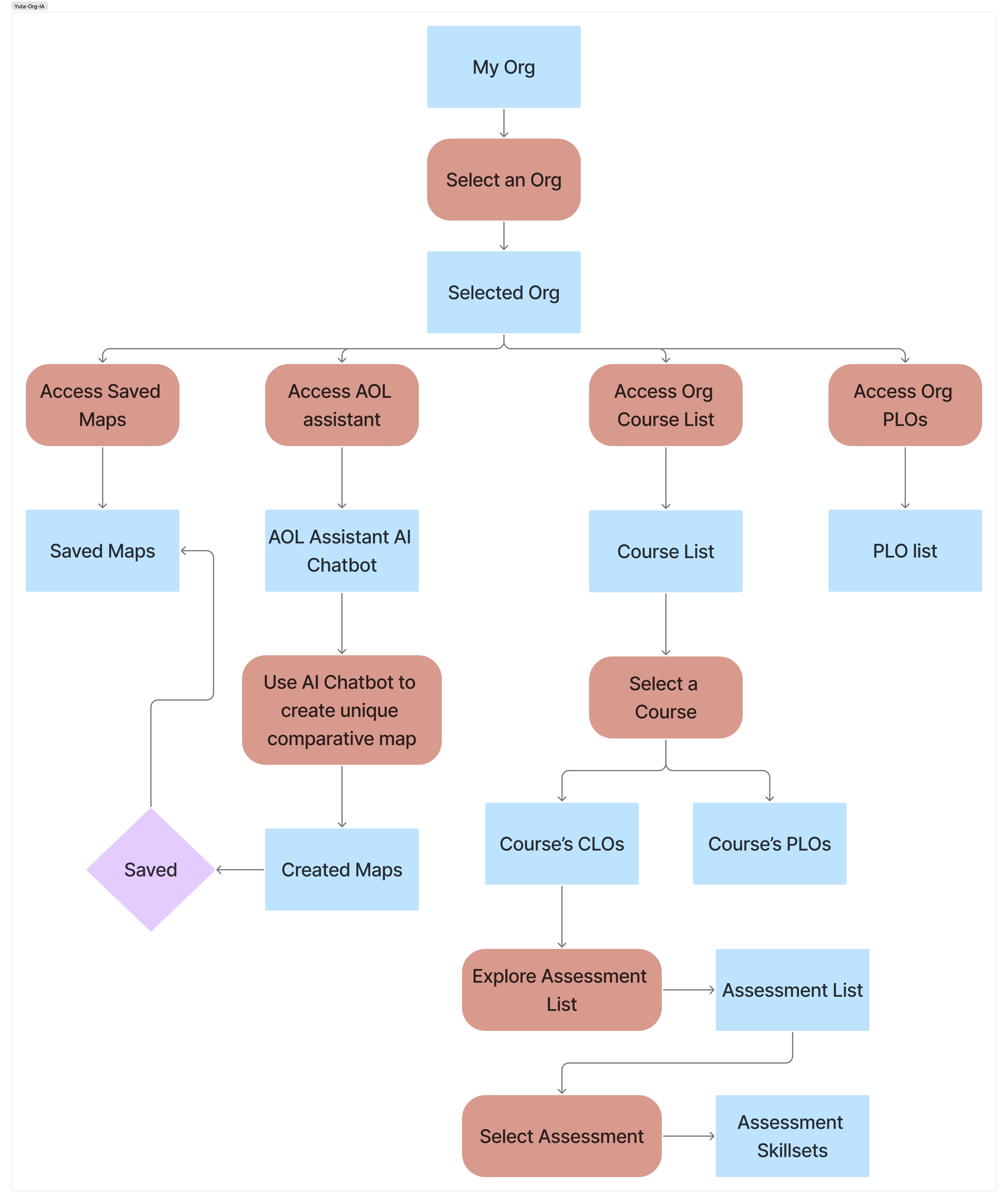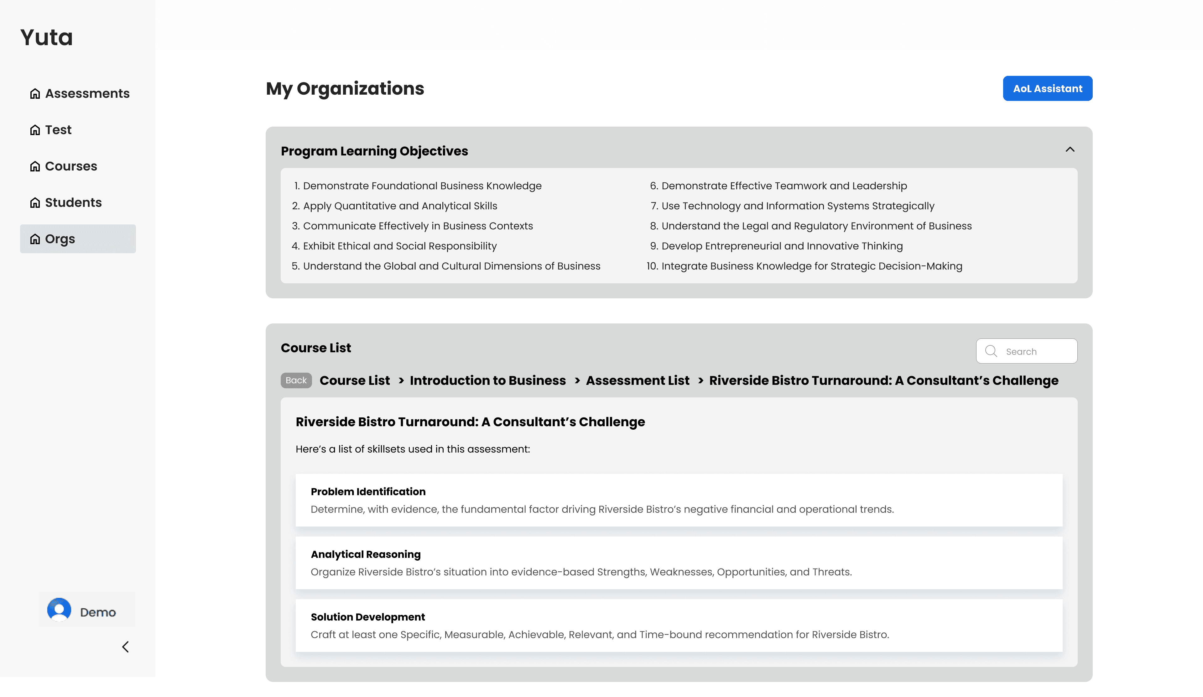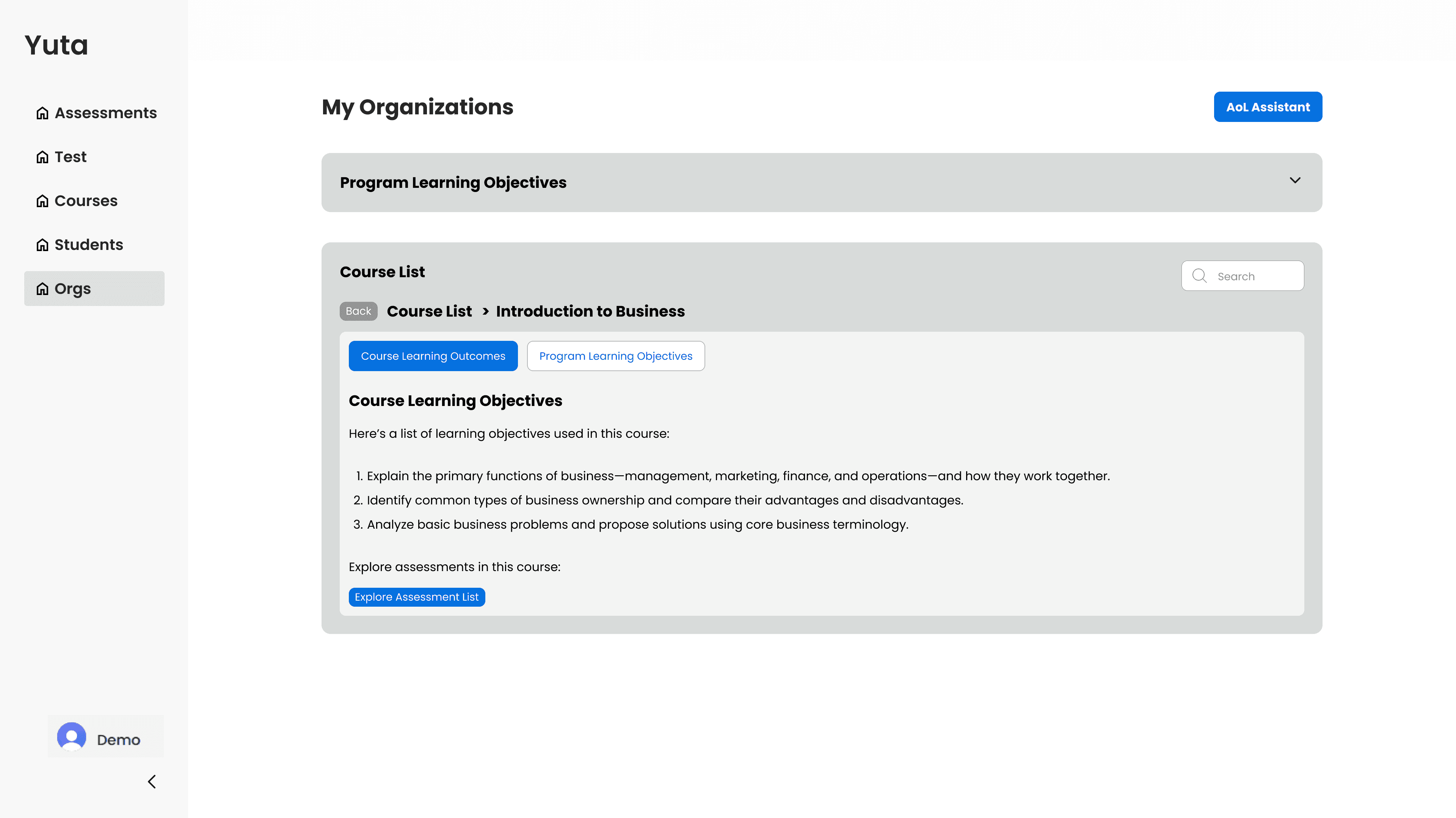 As for the AI feature within the “Org” page, the AI is accessible as an AoL Assistant and can help the admin visualize the overlap of CLOs and PLOs across multiple courses.
