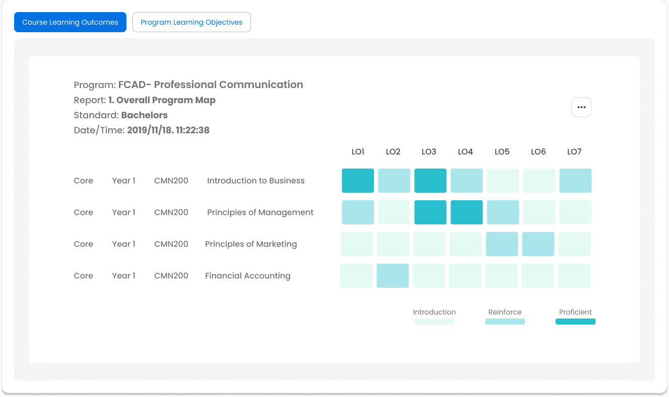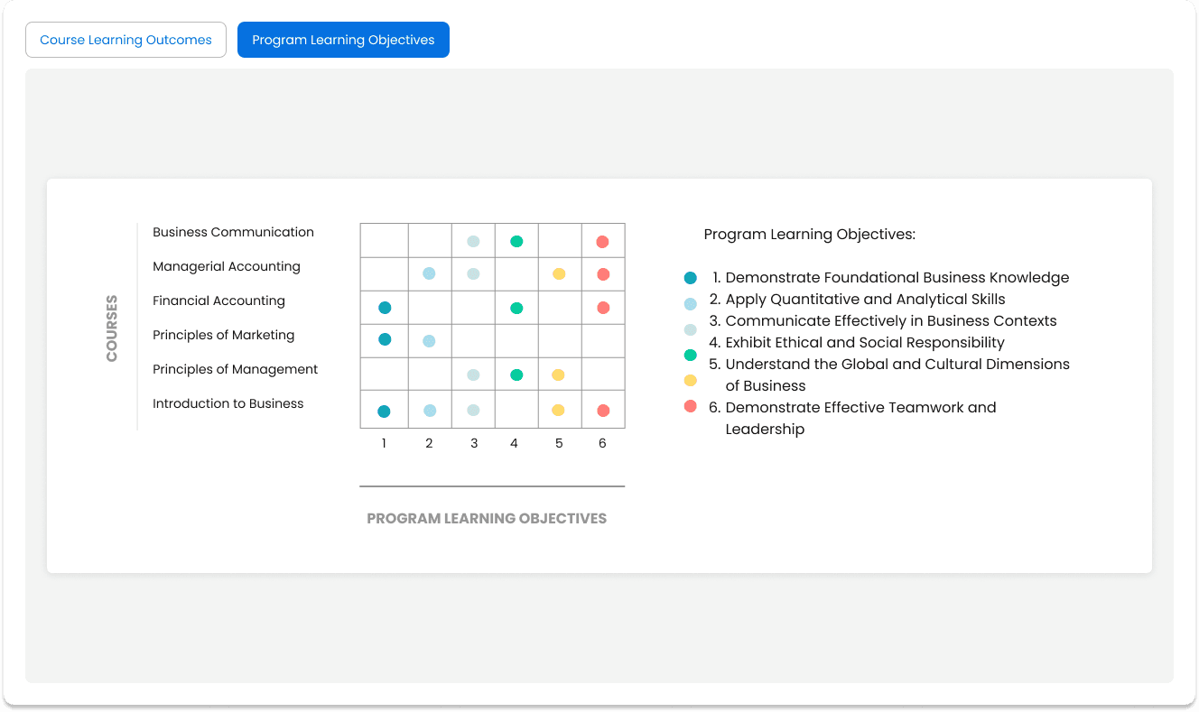 Goal: Provide an org-level view for business school admins to audit curriculum alignment and achievement across courses and programs.
