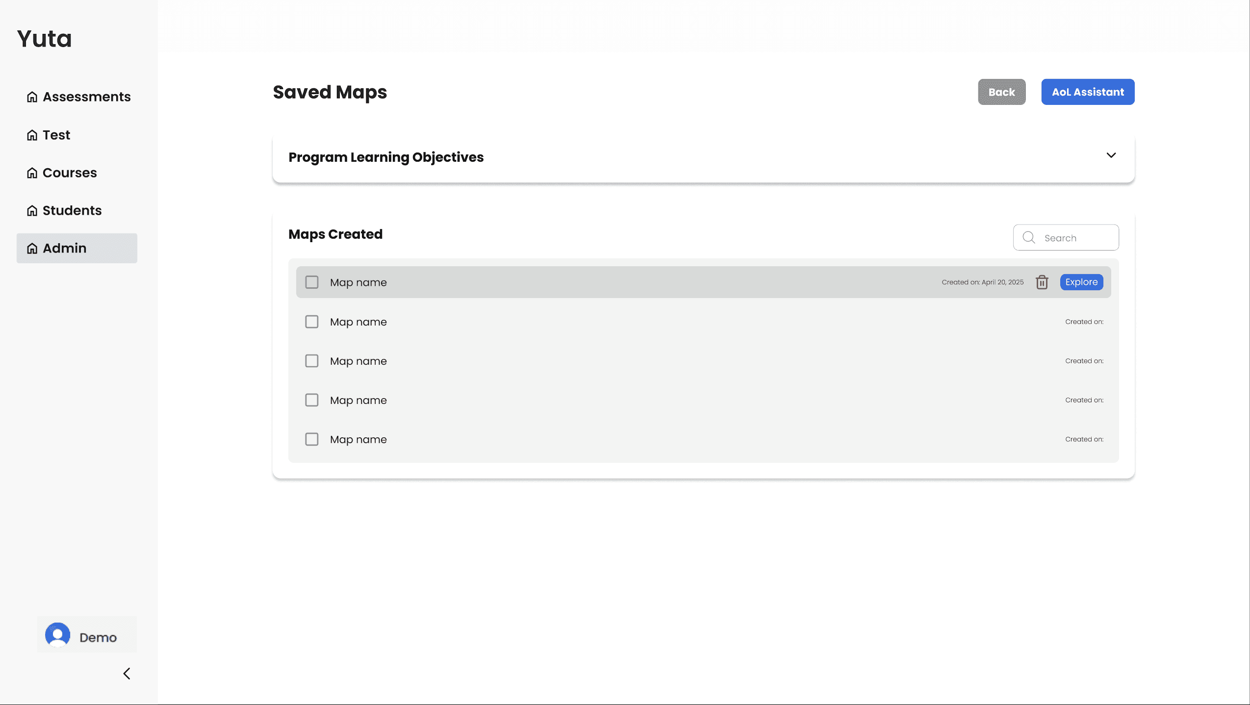 A list of PLOs within the entire organization is accessible through a drop-down present on most all pages excluding pages with maps generated by Yuta’s AI.